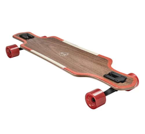 The Geminon 35 in colour Walnut/Cockatoo comes in size 35″ x 9″ x 24.75″wb. Symmetrical cut away longboard with drop-through trucks. It is a Slight side-to-side concave made of Walnut + hard rock maple. It features 180mm Slant reverse kingpin trucks and 70mm 83a Conical Cruiser wheels. Clear broadcast grip.