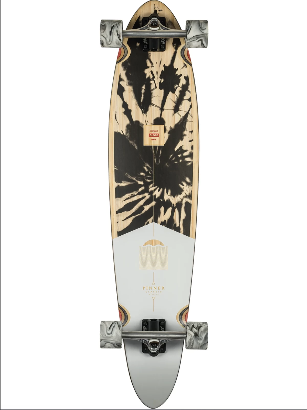 The Pinner Classic in Bamboo/Black Dye is a classic pintail longboard with a kicktail, featuring deck constructed from bamboo with tie-dye artwork. Featuring mellow concave,180mm Slant reverse kingpin trucks and 65mm 78a wheels. Finished with embedded metal badge detail and clear broadcast and black grip tape.
