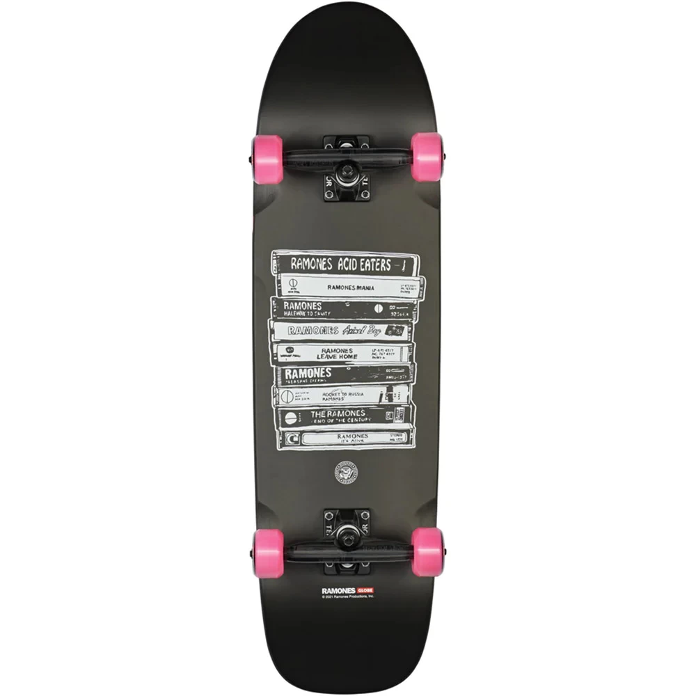 Shaped complete for having a good time whilst shredding. The Shooter 32″ Cruiser Board in Ramones/Hey Ho features deck with mellow concave, steep nose and tail kick, constructed from resin-7 hard rock maple and Canadian maple cross plies. This style also features 6.0” Tensor Alloy trucks, 55mm Conical 101a wheels and split black and printed grip tape. Iconic Ramones cassette-tape artwork on paint-dipped deck and split black grip tape with print.