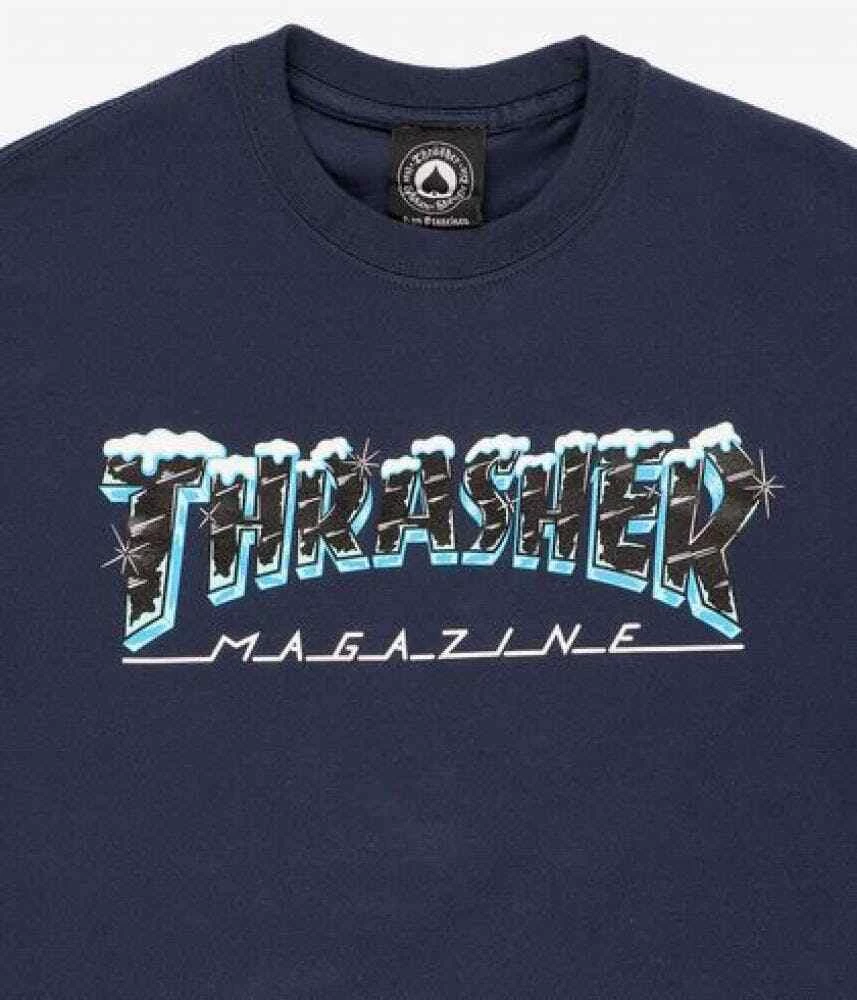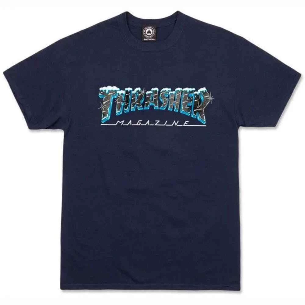 THRASHER Black Ice Short Sleeve T-Shirt NAVY BLUE | snow-capped thrasher magazine logo